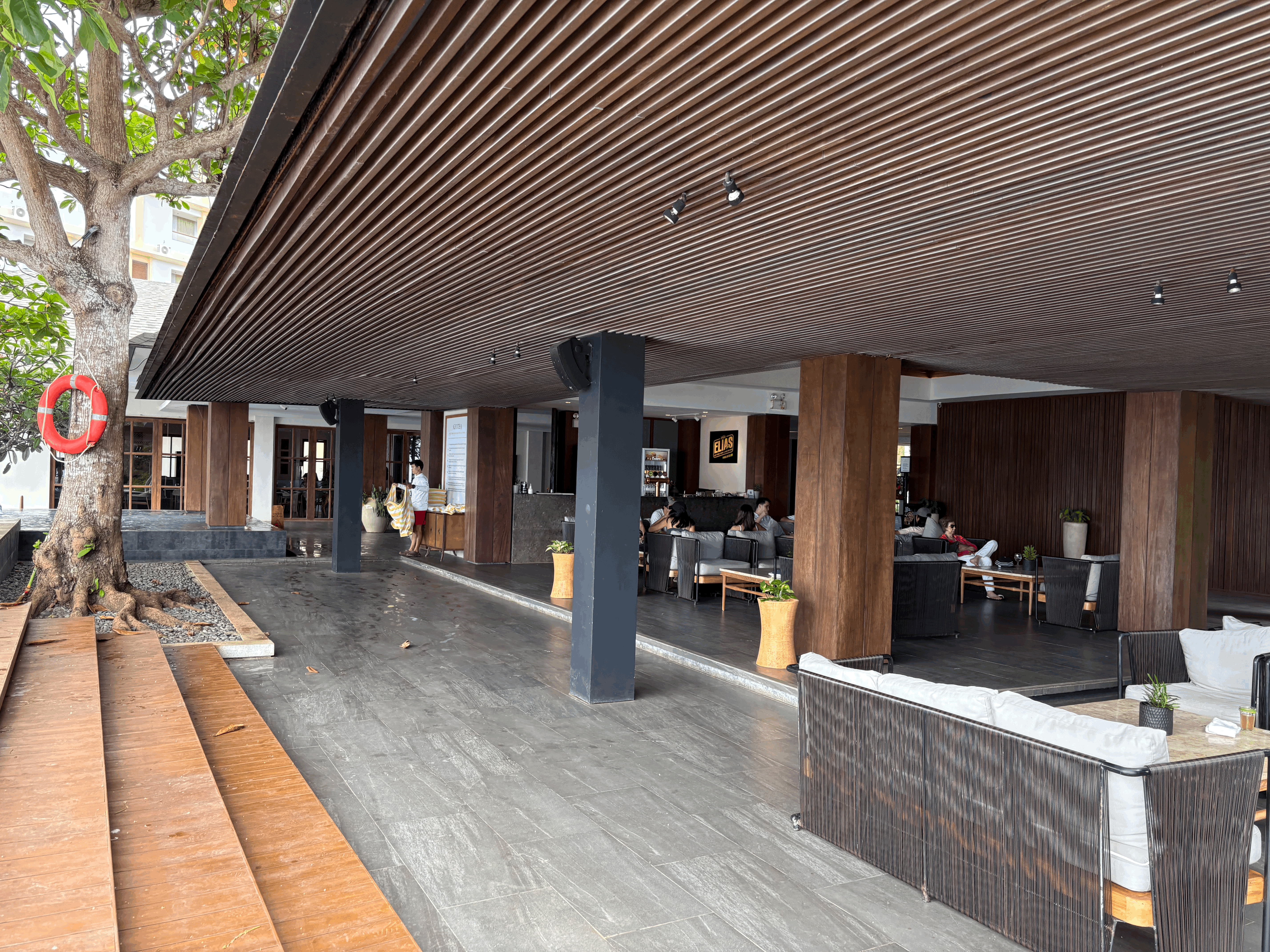 길을 따라 들어오면 로비 건물이있는데, 좌측에서는 체크인이 가능하고 1층에 수영장과 쉴 수 있는 좌석이 있습니다.