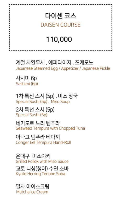 저는 캐치테이블로 쉽게 예약했고 다이센 코스로 주문했는데, 어떤 구성으로 나오는지 아래 사진으로 공유드리겠습니다.